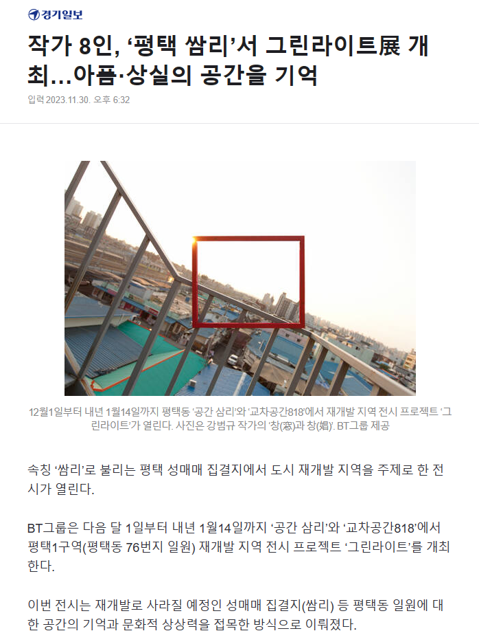작가 8인, ‘평택 쌈리’서 그린라이트展 개최…아픔·상실의 공간을 기억|2023.11.30 경기일보 <기사보기 클릭>
