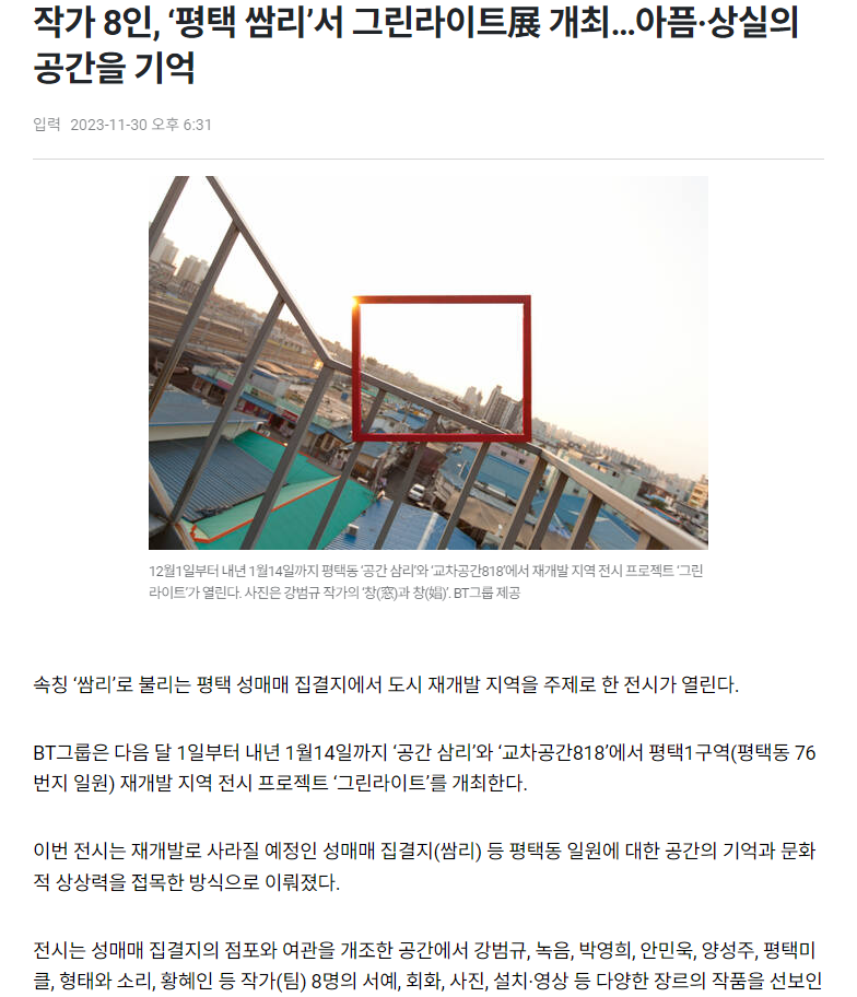 작가 8인, ‘평택 쌈리’서 그린라이트展 개최…아픔·상실의 공간을 기억 |2023.11.30 경기일보 <기사보기 클릭>