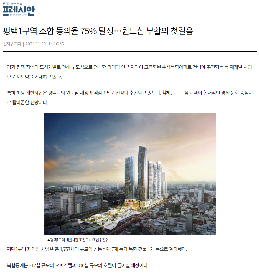평택1구역 조합 동의율 75% 달성…원도심 부활의 첫걸음 ㅣ 2024.011.29 프레시안