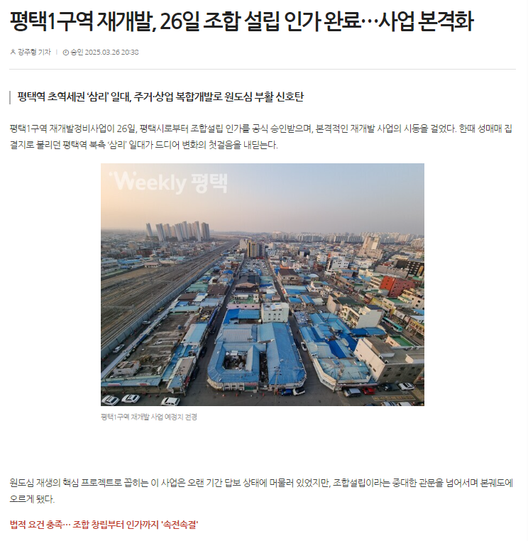 평택1구역 재개발, 26일 조합 설립 인가 완료…사업 본격화 ㅣ 2025.03.26 주간평택 <기사보기 클릭>