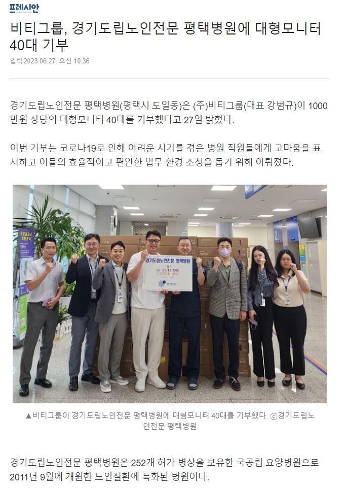 비티그룹, 경기도립노인전문 평택병원에 대형모니터 40대 기부 | 2023.06.27프레시안
