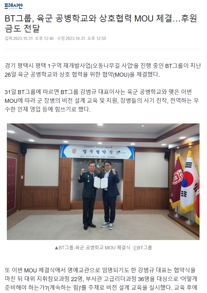 BT그룹, 육군 공병학교와 상호협력 MOU 체결…후원금도 전달|2023.10.31. 프레시안 <기사보기 클릭>